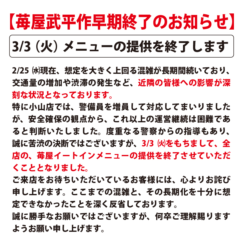 お彼岸期間中は栃木本店、小山店、宇都宮若草店のイートイン(武平茶屋・できたてキッチン)を下記の通りお休みさせていただきます。 3/16(月)~ 3/22(日) 7日間 お客様にはご迷惑をおかけいたしますが、ご了承くださいますようお願い申し上げます。 尚、店舗物販は全店通常通り営業しております。