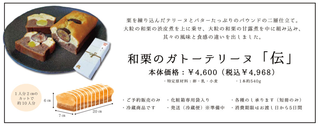 和栗のガトーテリーヌ「伝」ご予約承ります